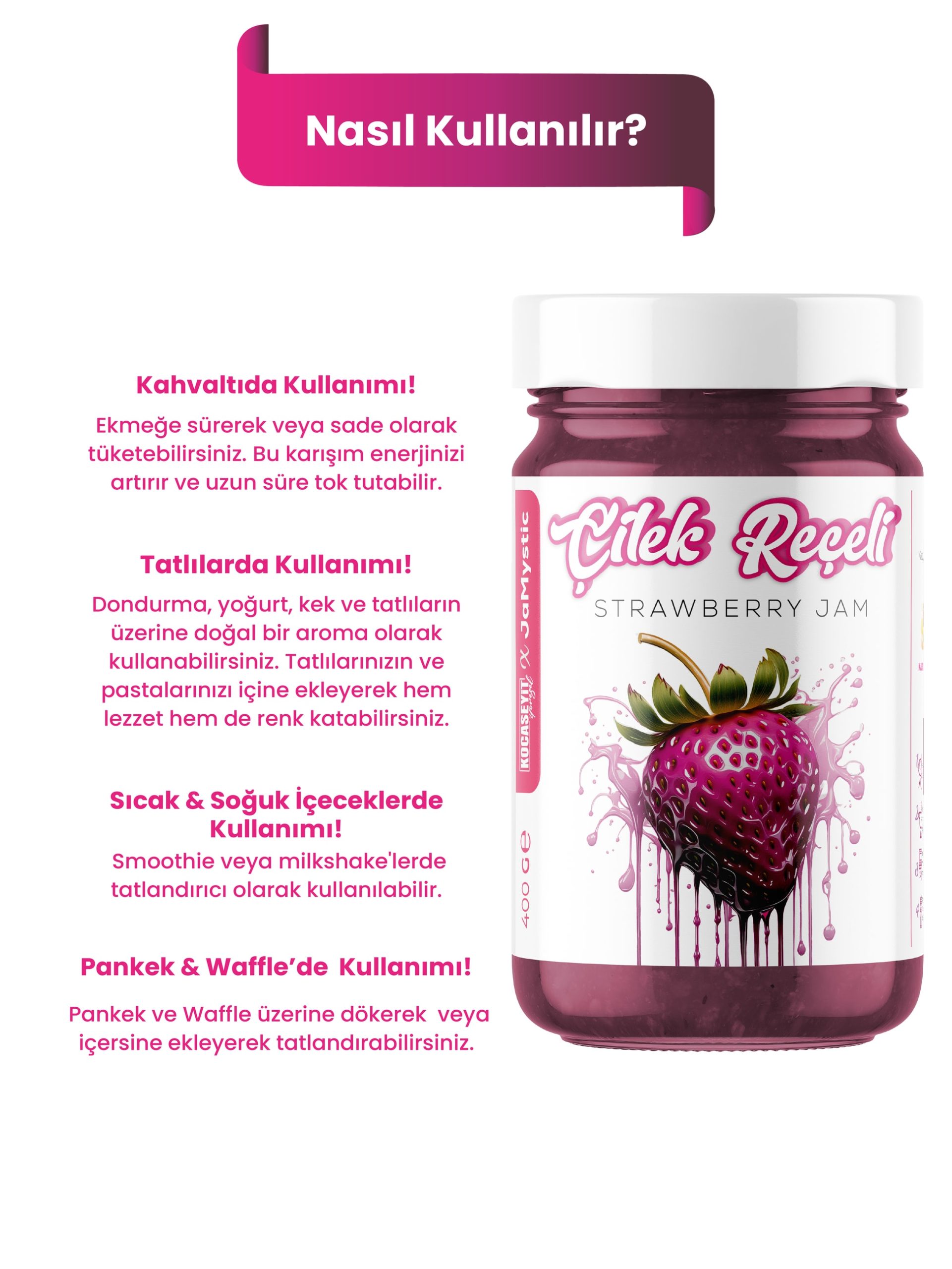 Kahvaltılara Renk ve Lezzet Katın Kocaseyit Çilek Reçeli, kahvaltılıklarınızın yanında, yoğurtla, pankeklerle veya tatlılarınızla birlikte tüketilebilir.
