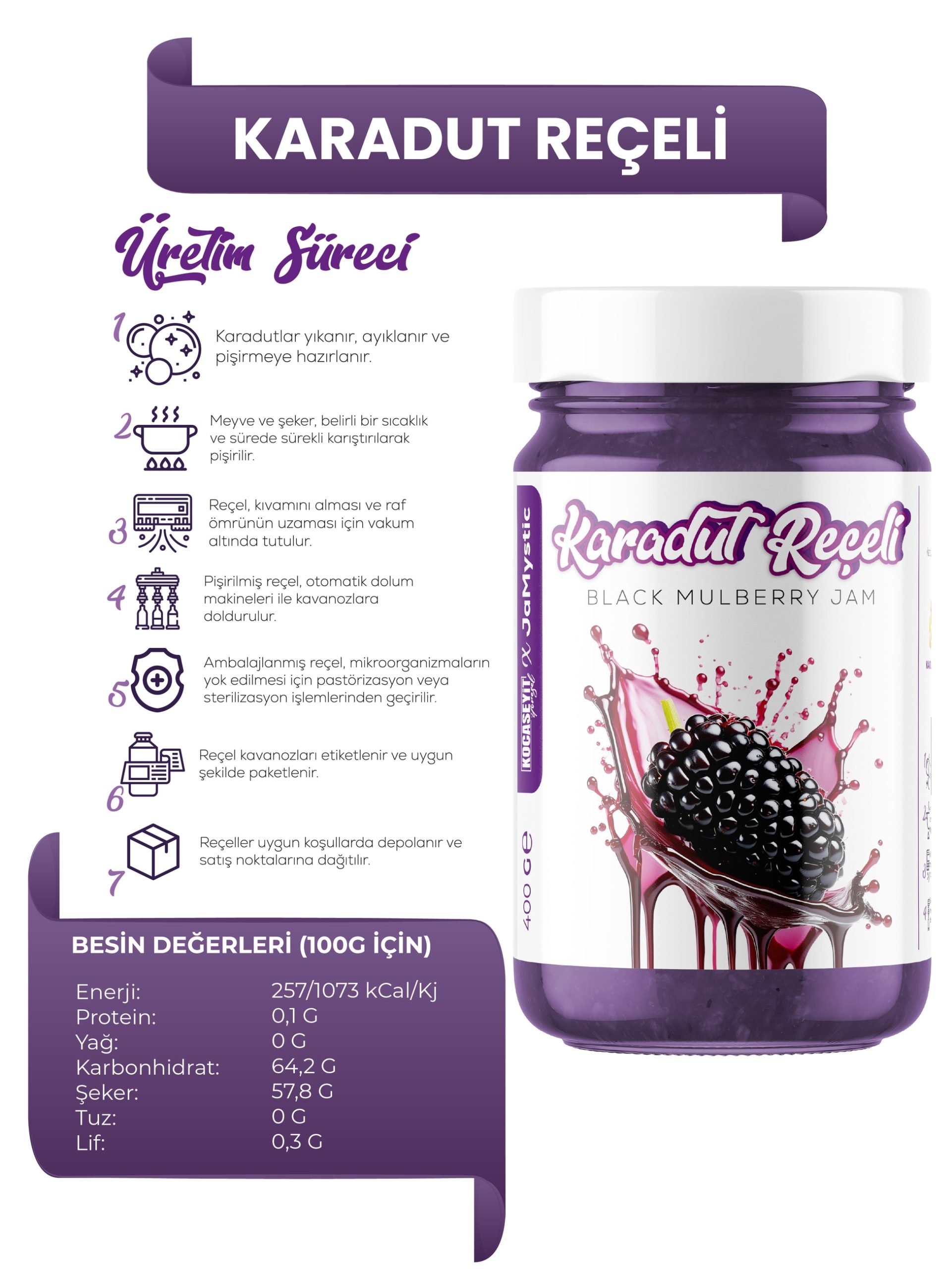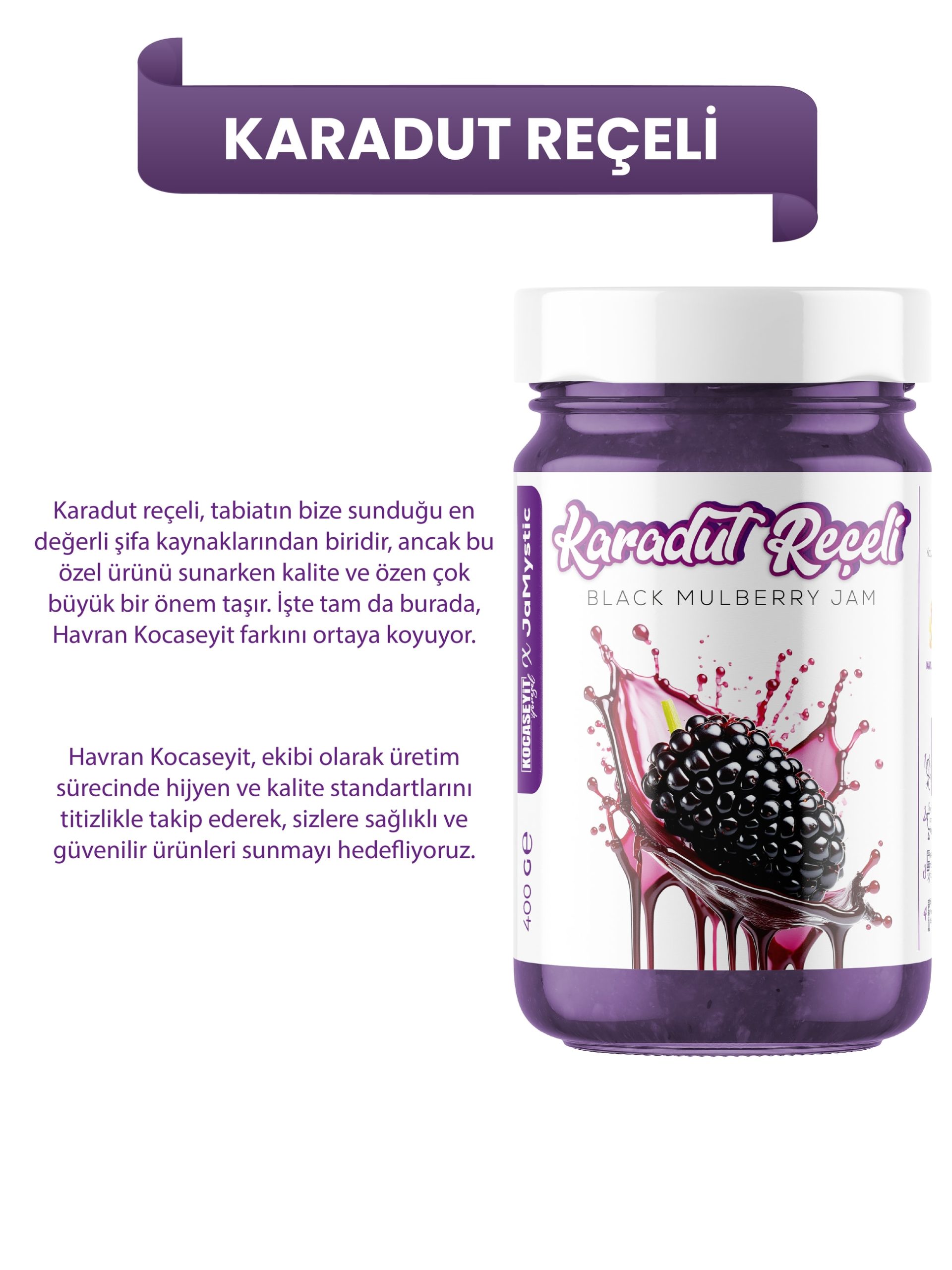 Kocaseyit® Karadut Reçeli – Mor Renkli Lezzetin En Doğal Hali Doğanın En Güzel Rengini Sofralarınıza Taşıyın Kocaseyit Karadut Reçeli, özenle seçilmiş taze karadutların geleneksel yöntemlerle reçele dönüştürülmesiyle hazırlanır.